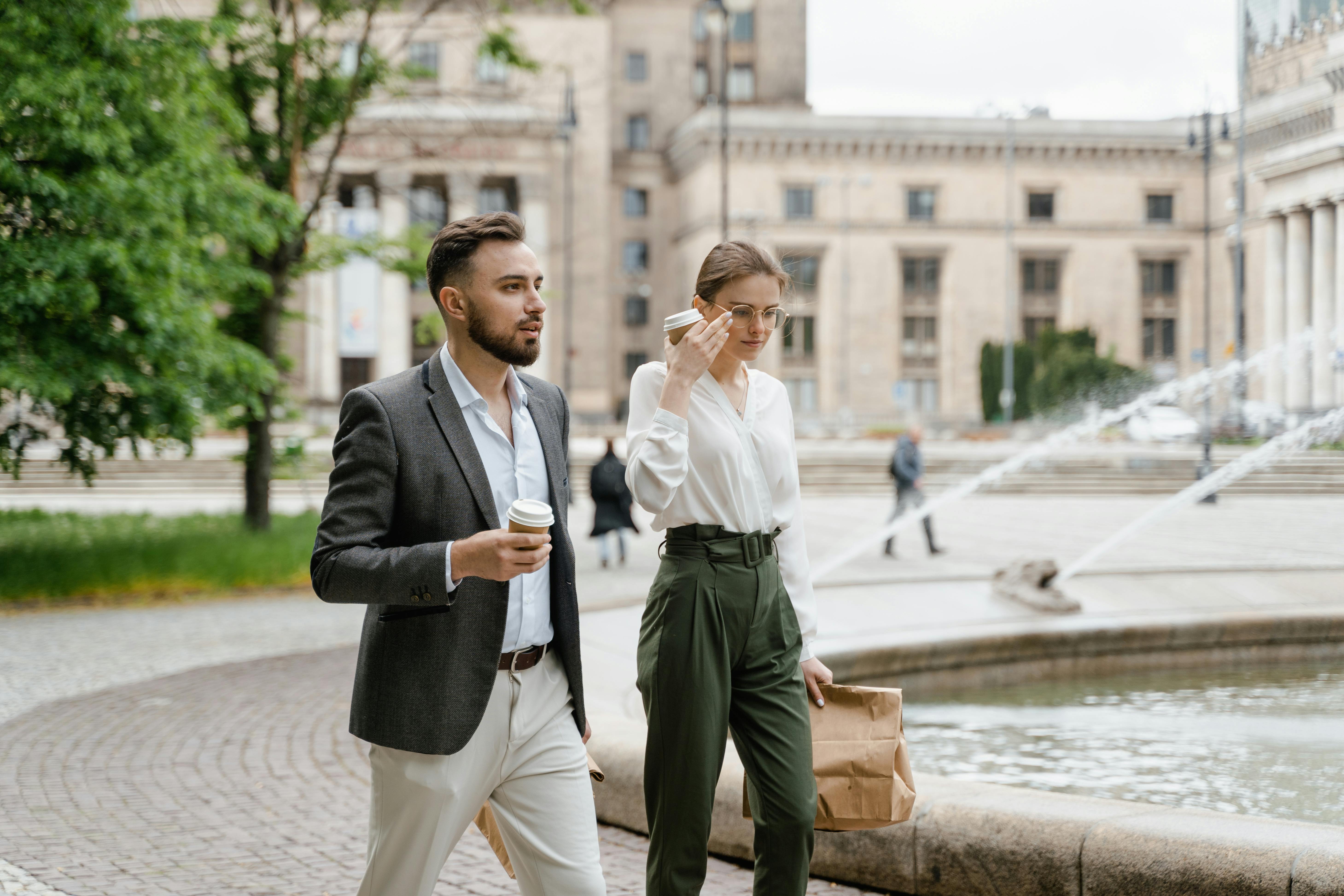 A man and woman in business attire walking by a city fountain, holding coffee cups and a paper bag. Photo Credit: Pexels @MART PRODUCTION